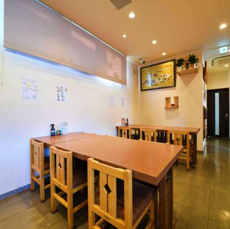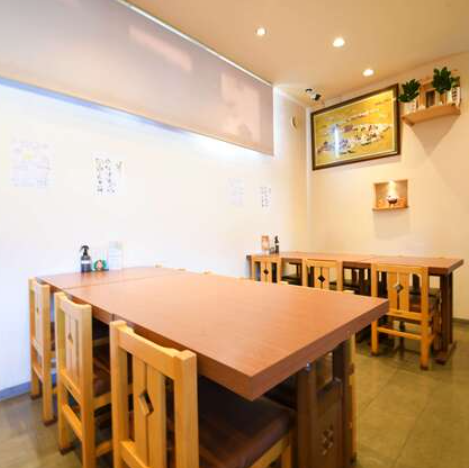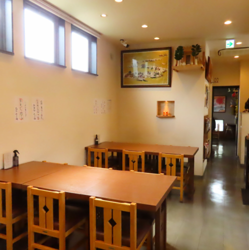 店内には 6名様用のテーブルが2卓あり、ご家族でのお食事や少人数の集まりにも最適。温かみのある木の家具が並ぶ明るい店内で、穏やかなひとときをお過ごしいただけます。